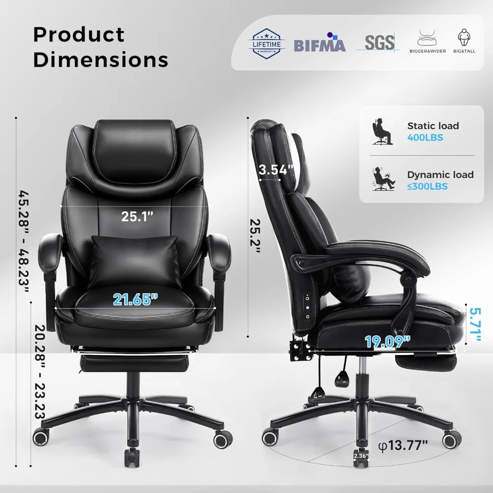 - THICKER CUSHION, WIDER SEAT: 5.71" spring-packed high-density foam tops the 3.5" industry average, 21.65" wide seat gives big and tall users cloud-like comfort; 8.07" padded backrest turns this big and tall office chair into an ergonomic throne for all-day desk work.