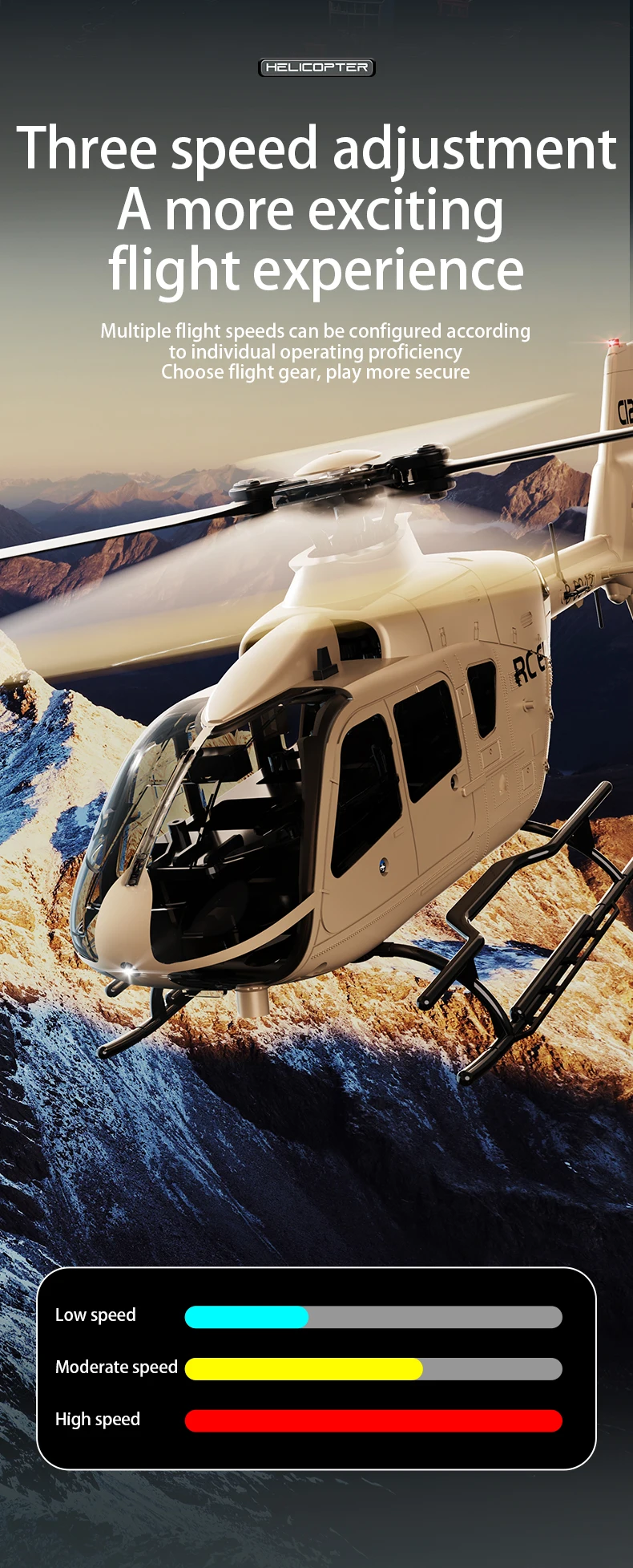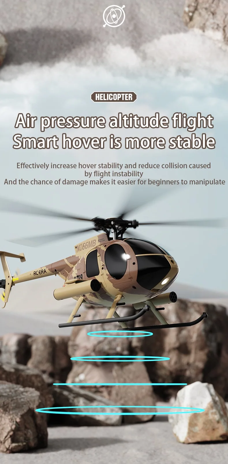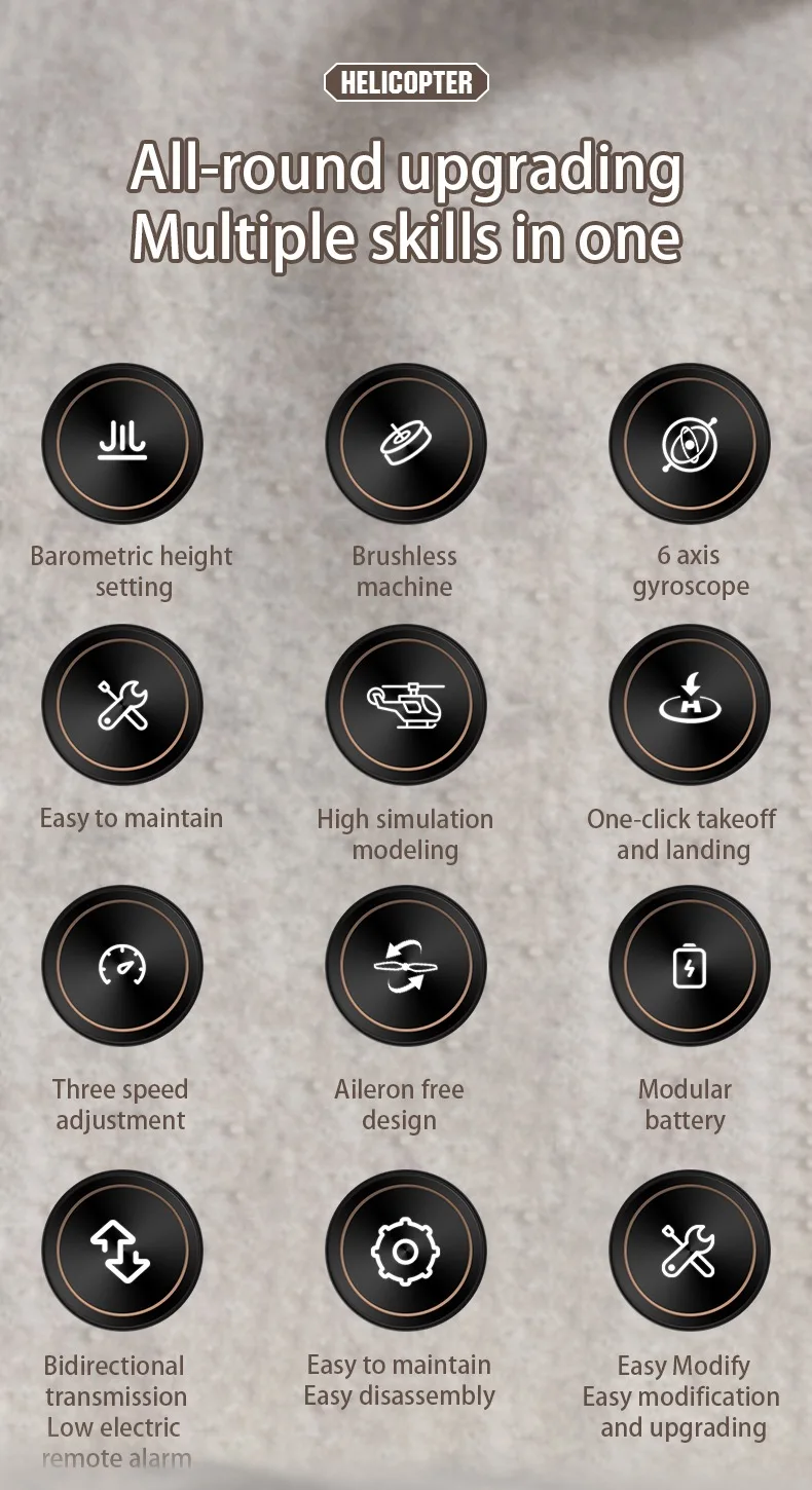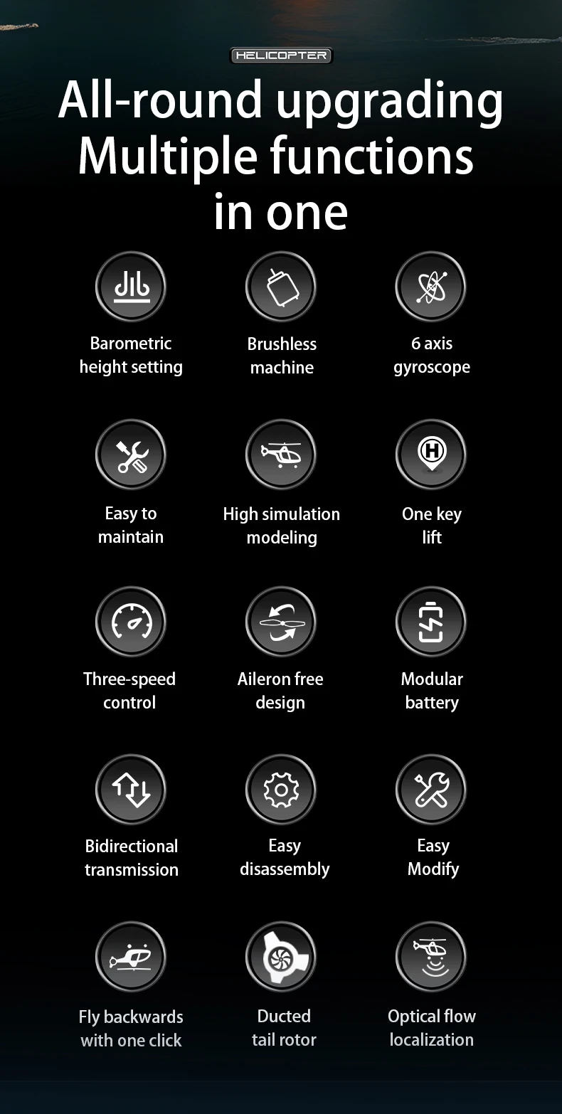 Product highlight: Adopting a single propeller without aileron design, 6-axis electronic gyroscope for stability enhancement, and incorporating a barometer for altitude control, hovering at height, add optical flow positioning, more stable flight and easier control! Long battery life! The appearance is scaled down according to the actual aircraft, which can not only control flight but also serve as a decoration.