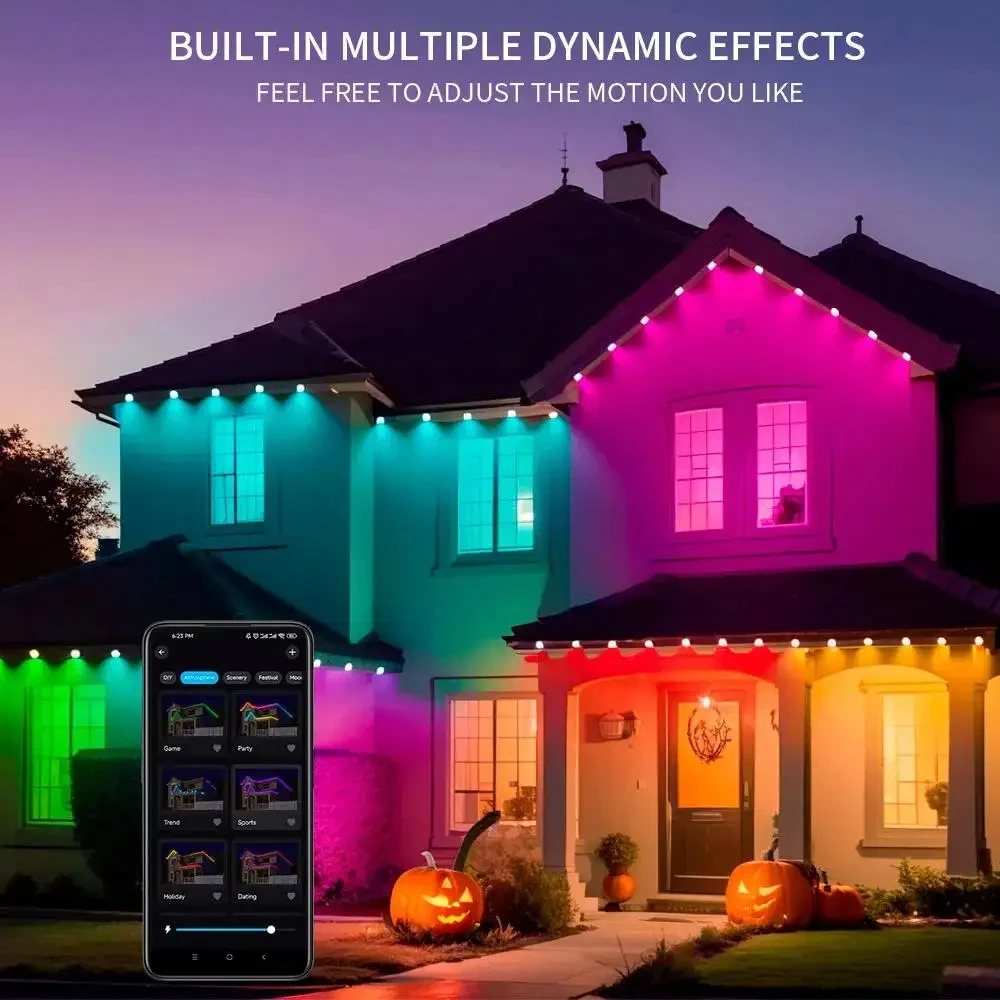 Permanent Outdoors Eaves Light 300FT 180LEDs APP Control Smart RGBIC Light DIY Music Sync & Timer Settings for Halloween Lighting