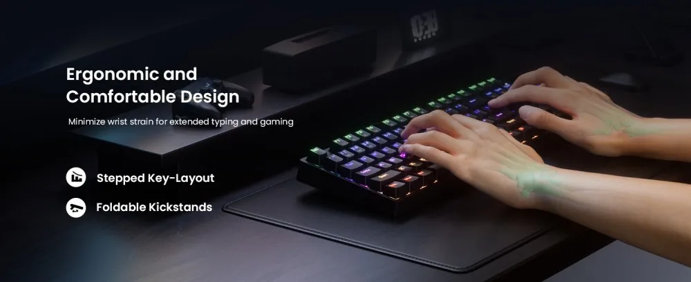 The ergonomic backlit keyboard keeps you typing comfortably for hours with its 7° adjustable tilt (2 kickstands) and Tiered key layout. Four anti-slip pads keep the keyboard firmly planted during intense sessions