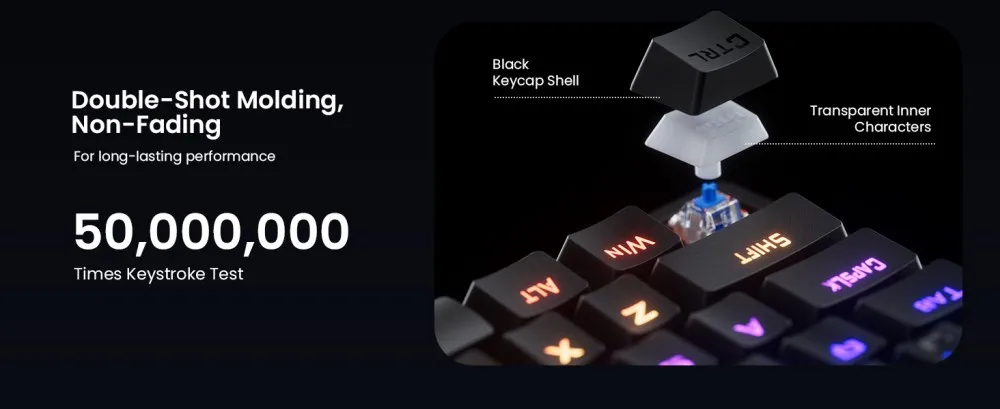 Designed for endurance, this clicky keyboard features double-shot keycaps with wear-resistant, high-light-transmission fonts that stay vibrant. Rigorously tested for 50M+ keystrokes, it works flawlessly across Windows PCs and laptops
